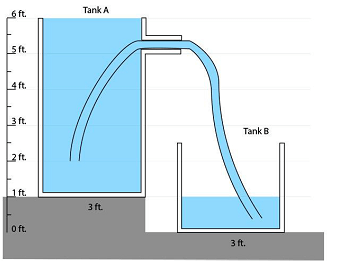 Two water tanks A and B of equal square base of sides 3 feet are shown below. Water flows from tank A to tank B through a tube. What will be the volume (in cubic feet) of water in Tank A when the water stops flowing? (NAT)