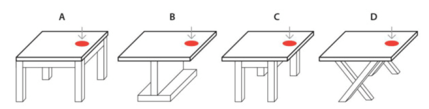 Four square table-tops of the same dimensions are shown below. Only the designs of their supports are different from each other. If a person stands upright on the red mark on each of the tables, which of the tables will topple? (MSQ)
